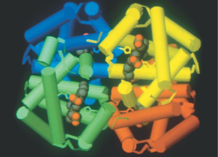 A hemoglobin (the oxygen-carrying molecule in red blood cells) is composed of 2 kinds of protein chains.