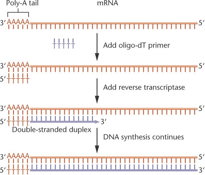 Reverse transcriptase uses the mRNA as a template to synthesize a complementary DNA strand (cDNA) and forms an RNA/DNA double-stranded duplex.