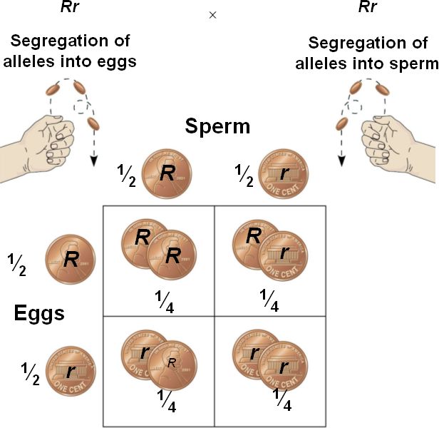 When a heterozygote (Rr) forms gametes, segregation of alleles is like the toss of a coin.